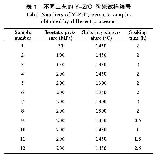 將氧氯化鋯、硝酸釔、硝酸鋁按比例配置成溶液,氨水為沉淀劑,采用共沉淀法制備出釔穩(wěn)定氧化鋯粉體,加入一定比例的PVA,水為介質(zhì),濕法球磨,烘干、造粒,得到可成型的釔穩(wěn)定氧化鋯粉(Y-ZrO2)。在8.3MPa壓力下干壓,然后在不同壓力下冷等靜壓成型,將制得的生坯在不同溫度下燒結(jié),并保溫不同時(shí)間,研究等靜壓壓力、燒結(jié)溫度、保溫時(shí)間對(duì)陶瓷密度、抗彎強(qiáng)度、硬度和斷裂韌性的影響。具體試樣編號(hào)如表1所示。