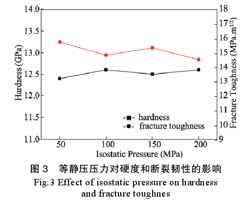 不同等靜壓壓力對(duì)Y-ZrO2陶瓷硬度和斷裂韌性的影響如圖3所示。